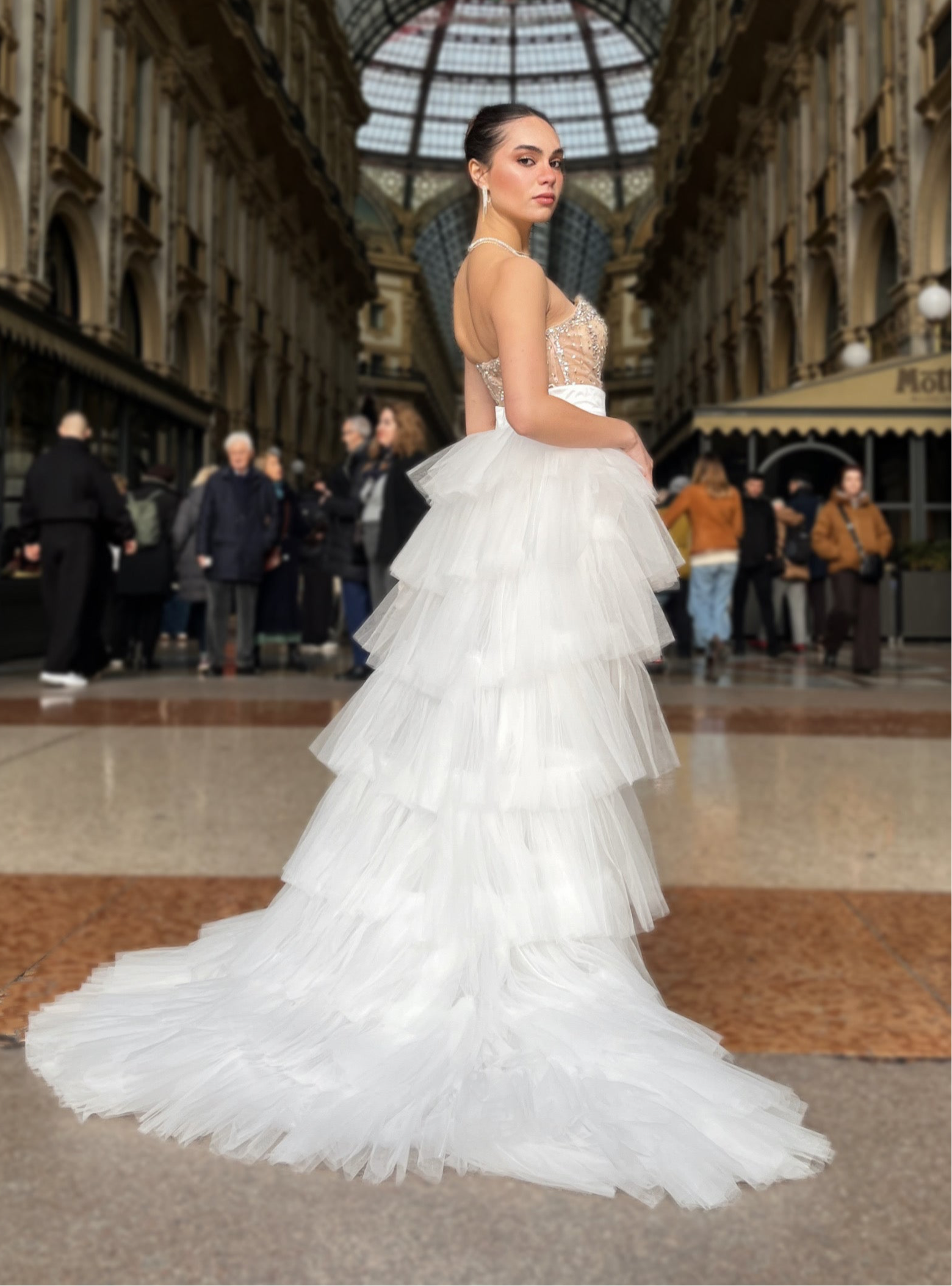 LUNGO DIERTO , CON CODA STACCABILE , VESTE ELASTICO, 2 PEZZI : TUBINO NUDE E GONNA BIANCA
